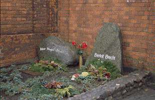 Einfache Grabsteine schmücken die Gräber von Helene Weigel, Schauspielerin, Regisseurin und Ehefrau und Bertolt Brecht. Beide verbrachten ihre letzten Lebensjahre in dem Haus neben dem Friedhof, heute Brecht/Weigel Gedenkstätte.