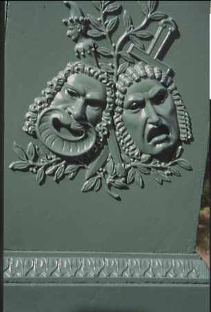Ein bemerkenswertes Grabmal für den Schauspieler Ludwig Devrient. Sein Grabstein zieren zwei Masken, sie stehen als lachende Maske für die Komödie, die trauernde für die Tragödie.