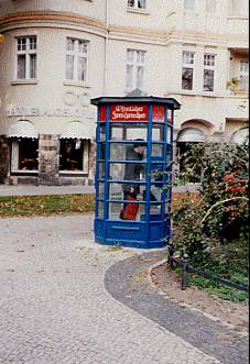 Hier muß man zweimal hinsehen! Telefonhäuschen in ungewöhnlichem Design. Nostalgie seit der Umgestaltung des Mexikoplatzes anläßlich der 750-Jahrfeier Berlins